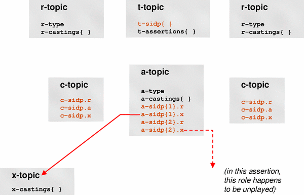 The a-topic of an assertion is connected to each of the x-topics. The a-topic's a-sidp property consists of a set of so-called casting pairs, one for each of the roles of the assertion. Each of the casting pairs has an x value component, the value of which is one of the x-topics of the assertion. In the diagram, the first casting pair (a-sidp{1}) is one of the value components of the a-sidp property, and the value of one of the pair's components (a-sidp{1}.x) is the x-topic on the left. (Since there is no role player of the role on the right side of the diagram, the a-sidp{2}.x component has no value.)
